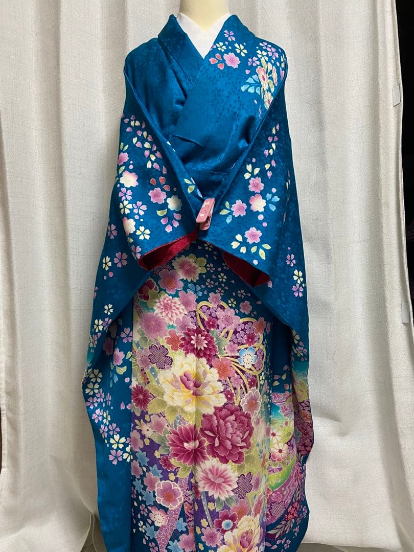 値引 振袖 未仕立て 成人式振袖 振袖 友禅 23点 振袖フルセット 新品ショール着付け道具付き 22点セット「紺 正絹 振り袖 梅に楓と鈴」仮絵羽 友禅 着物・浴衣